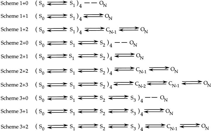 Figure 2. Classes of gating models for Shaker potassium channels. For each model, each of four subunits undergoes one, two, or three transitions between subunit states, designated by S0, S1, etc. In some of the models, the channel undergoes one, two, or three additional concerted transitions. The models are named by the number of subunit transitions and additional concerted transitions. For models with no concerted transitions, the channel is taken to be open after the fourth subunit has undergone the last subunit transition; this is indicated by the dashed line to the open state.
