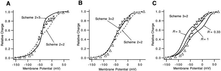 Figure 12. Constraints on how to add more transitions to Scheme 2+2′ were provided by the shape of V2's Q-V relation. (A) V2's mean Q-V relation has been superimposed (solid curve) with predictions of Scheme 2+3′, with the concerted transition in the third to last position having a valence of 3.5. This model steepens the Q-V relation compared with the predictions of Scheme 2+2′ (dashed curve). However, it yields a Q-V relation that is too steep at voltages near −40 mV, while remaining too shallow at hyperpolarized voltages (near −80 mV). For the simulations, the parameter estimates for all but the large valenced transition were fixed to be the same as in Scheme 2+2′; the midpoint voltage of the new transition was varied to best account for V2's Q-V relation. (B) Scheme 3+2′ performs better at steepening V2's Q-V relation across the entire voltage range. For these simulations, the parameter values for S0 ↔ S1 and S1 ↔ S2 were those given for the same transitions in Scheme 2+2′ in Table II. For S2 ↔ S3, we assigned a charge (0.88 e0) that is one-fourth of the charge (3.5 e0) assigned to the concerted transition in Scheme 2+3′ in A. Its midpoint voltage was varied to yield the best fits of the data. (C) V2's Q-V relation was also used to obtain a rough estimate of the equilibrium constant for S2 ↔ S3. Three different simulations of Scheme 3+2′ are shown for different values of a factor R (R = 3, 1, and 0.33) that reflect the ratio of the equilibrium of S2 ↔ S3 versus that of S1 ↔ S2. In these simulations, the charge associated with S2 ↔ S3 was assigned to be the same as that associated with S1 ↔ S2, given in Table II.