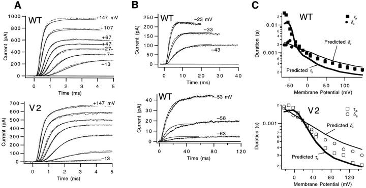 Figure 13. Scheme 3+2′ accounts for WT's and V2's macroscopic ionic current time courses across a wide voltage range. Simulations are shown for currents measured at depolarized voltages (A) and at intermediate voltages (B). The holding potential was −93 mV. To allow comparison of Scheme 3+2′ with Scheme 2+2′, the simulations of activation time courses here were made while incorporating changes to Scheme 3+2′ identical to those made for Scheme 2+2′ in Fig. 8; we have added a transition from the last closed state to the state CiN-1 (and also the transition CiN-1 ↔ CiN). The rates for these additional transitions are those given in the legend to Fig. 8. All current traces for WT and V2 come from the same two WT and V2 patches (w312 and v096). (C) The good fits of the ionic currents are also reflected in a comparison of the τa and δa parameters (symbols, lines) derived from the measured/simulated currents. The τa values at high depolarized voltages (V ≥ +67 mV) reflect the fast time constant in fits of the measured and simulated currents to the sum of two exponentials.
