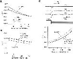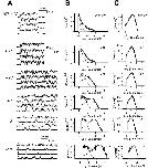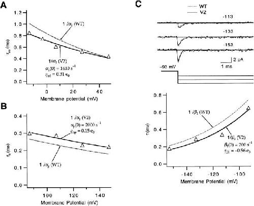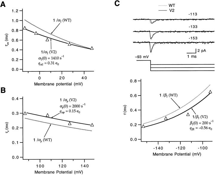 Figure 4. Estimates of α1, αp, and β1 for V2. (A) The voltage dependence of α1 was estimated by fitting an exponential to τon values derived from the on gating currents at voltages between −13 and +47 mV. From the data in the patch shown in Fig. 3 A, estimates were obtained α1(0) = 1,410 s−1 and qα1 = 0.31 e0, which are similar to WT's (dotted curve). (B) The voltage dependence of V2's αp was estimated by fitting an exponential to V2's τa values taken from macroscopic ionic current time courses measured between +87 and +147 mV. From the data in the patch shown in Fig. 2 A, estimates were obtained (αp(0) = 2,000 s−1 and qα1 = 0.15 e0) that are similar to WT's (dotted curve). (C) The voltage dependence of β1 was estimated from gating currents induced by voltage steps between −93 and −153 mV. These gating currents for V2 (solid curves, top) are nearly superimposable with WT's (dotted curves). Patches v240 and w249. The bottom plot shows that the time constants of the single exponentials fitted to the decay of V2's currents in this patch yielded estimates (β1(0) = 200 s−1 and qβ1 = −0.56 e0) that are similar to the mean estimates obtained for WT's β1 (dotted curve).
