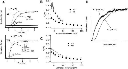 Figure 2. V2's effects on activation kinetics. (A) At both low and high voltages, V2 has slower channel opening kinetics, reflected here in a comparison of WT and V2 currents at +7 and +147 mV. Patches w312 and v096. V2's ionic current at +7 mV was fitted to a single exponential to estimate the activation time constant τa and an activation delay δa. The current at +147 mV was fitted to the sum of two exponentials, I(t) = (Af + As) − Afe−(t−δa)/τa +Ase−(t−δa)/τs. The faster time constant is τa, which is taken to reflect the kinetics of the main activation path (Schoppa and Sigworth, 1998a). (B) The derived values for τa for V2 are larger than WT at V < +67 mV, but are similar at higher voltages. Individual values reflect two to seven experiments. Error bars are smaller than the symbols in many cases. (C) WT and V2 have similar, though not identical, values for the activation delay δa (from the same experiments as in B). (D) Comparison of the sigmoidicity of WT and V2 ionic currents at voltages where the two channels have Po ≅ 0.2. The current traces have normalized amplitudes and have their time axes scaled to yield the same rising phase kinetics of the current. Patches w312 and v142.