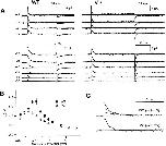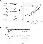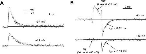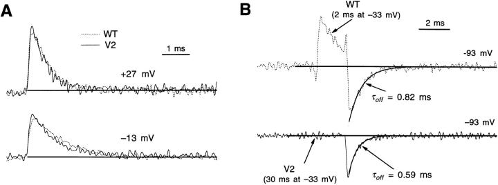 Figure 7. V2 has little effect on αd and βd gating currents. (A) WT (dotted curves) and V2 have nearly superimposable on gating currents at −13 and +27 mV, including similar time courses near the peak of the current. The current amplitudes were scaled slightly so that the peaks match. Patches w212 and v219. (B) Comparison of WT's and V2's off gating currents, following voltage steps that preload channels into late closed states but not the open state. For WT, the current was measured after a 2-ms pulse to −33 mV, and V2's current was measured after a 20-ms pulse to the same voltage. WT and V2's off currents have been fitted to a single exponential, yielding similar time constants τoff. The slightly slower time course for WT probably reflects the contribution of the small fraction of channels that are open at that end of the prepulse, which contribute a small slow component to the off current. Patches w217 and v219.