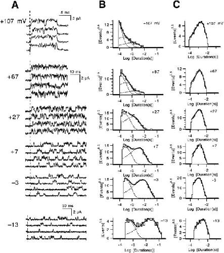 Figure 9. V2 single channel activity at voltages between −13 and +107 mV. (A) Single channel activity induced by steps from −93 mV to the indicated voltages. The data displayed at voltages between −3 and +67 mV reflect measurements in one patch (v433) and are plotted on the same scale. The data at the two extreme voltages reflect two additional patches (v428 and v344). The dashed vertical line reflects the beginning of the test pulse, and, for all but the currents at +107 mV, the currents measured after the test pulse are not shown. In our measurements, V2's single channel conductance was usually ∼30% smaller than WT's (corresponding to a change in conductance from 11 to 8 pS). (B) Closed time histograms derived from the experiments shown in A. Superimposed solid curves on histograms are fits to mixtures of two or three exponentials; dashed curves illustrate each component. Each histogram contains at least 630 events. (C) Open time histograms, each fitted with a single exponential.
