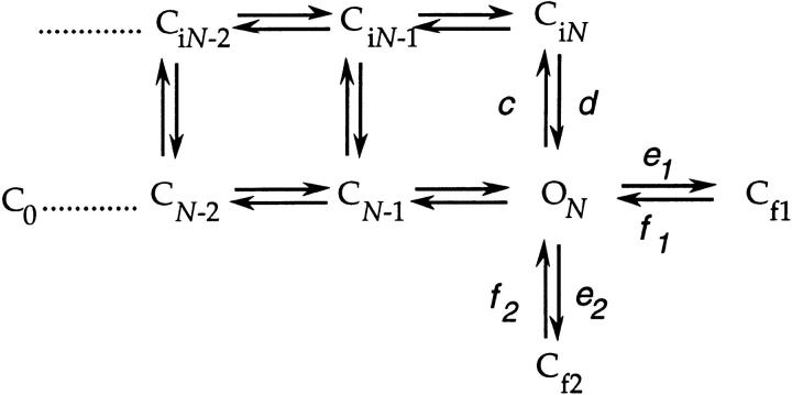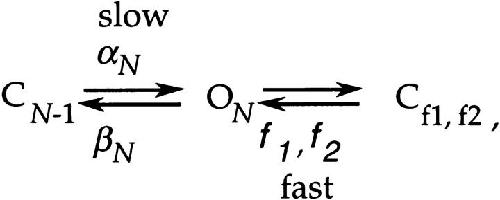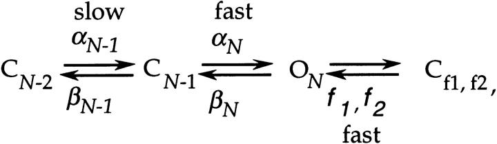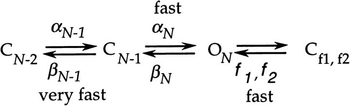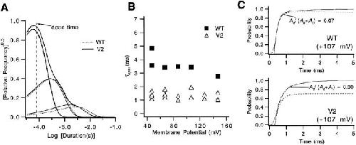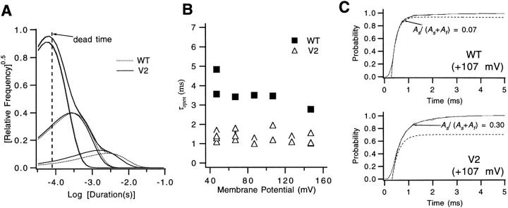 Figure 10. V2's effects on transitions to closed states outside of the main activation path. (A) WT (dotted curves) and V2 have nearly superimposable closed dwell-time histograms at very large depolarizations, indicating that the V2 has little effect on the transitions from C iN, C f1, and C f2 that correspond to each of the three components in these histograms. The time constants and amplitudes of the three exponentials fitted to 5 WT and 22 V2 closed time histograms at V ≥ +47 mV were averaged, and the curves reflect the derived means. (B) The measured open times for V2 at large depolarizations (▵) are approximately one-third as long as WT's (▪), indicating that V2 destabilizes the open state relative to C iN, C f1, and C f2. Open times are uncorrected for missed events, but may be compared since WT and V2 display the same closed time distributions at these voltages (from A), and the analysis filtering bandwidths were set to be equal for WT and V2. Each value reflects a single experiment. (C) WT (top) and V2 (bottom) cumulative first latency histograms at +107 mV were fitted to the sum of two exponentials (see legend for Fig. 2 A), starting at the time when P = 0.5. The dashed curves reflect the fast component in the same fits. The main difference between the fits for WT and V2 is the amplitude of the slow component with time constant τs, indicating that V2 increases the probability that a channel enters Ci states from closed states in the activation path. In the fitting, the values for τs for WT and V2 were 1.9 and 1.3 ms, respectively; values for the fast time constant τa were 0.21 and 0.29 ms. The values for Af and As in the fits were adjusted for the delay in the fitted function. The two histograms reflect 182 and 258 sweeps, respectively. Patches w266 and v344.