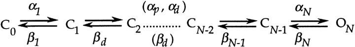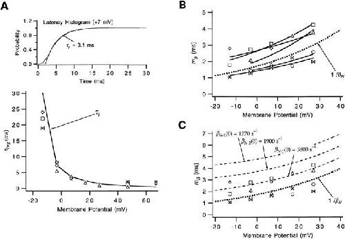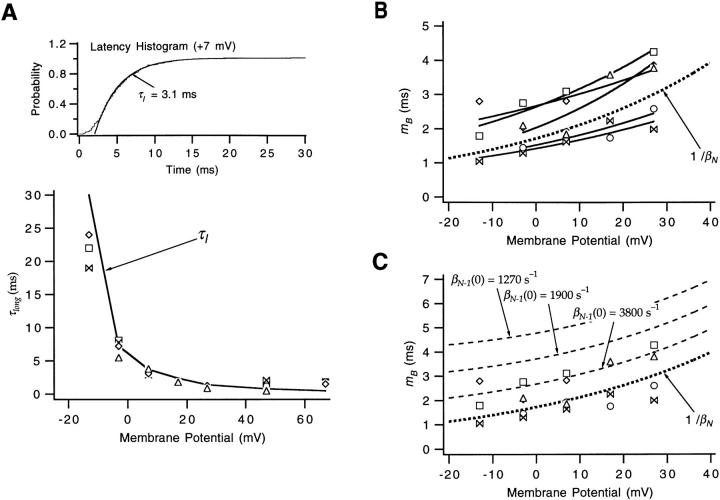 Figure 11. Estimates of βN-1 from V2's single-channel burst durations. (A) V2's cumulative first latency histograms at V2's activation voltages were well-fitted by a single exponential; an example is shown at top. As shown in the plot at the bottom, the time constant τl of the fitted exponential is similar to the time constant τlong of the longest duration exponential component in V2's closed time histograms. The τlong values at V ≤ +27 mV always reflect the longer of two fitted exponentials, and all but one of the τlong values at V ≥ +47 mV reflects the longest of three fitted exponentials. At high voltages, τlong reflects closures in Ci states and is generally longer than the latency time constant. Values reflect data obtained from five patches. (B) The mean duration mB of the bursts of openings separated by long closures had values similar to the reciprocal of V2's channel closing rate (bold dotted curve), defined by the parameters βN(0) = 580 s−1 and qβN = −0.53 e0. The mB values at V ≤ +27 mV were calculated by normalizing the measured channel open time by the fraction of the measured closures that correspond to the longer duration exponential component in fits of the closed time histograms to the sum of two exponentials. Solid curves reflect fits of the mB values obtained in each of the patches to an exponential, yielding estimates of mB(0) and qmB. Data reflect the same experiments as in A. (C) The same mB values as in B have been superimposed with the predictions of Eq. 5 for different values of βN-1(0). In the calculations, αN(0) was assumed to be 1,900 s−1. The charges qαN = 0.18 e0 and qβN-1 = −0.30 e0 were the WT values.