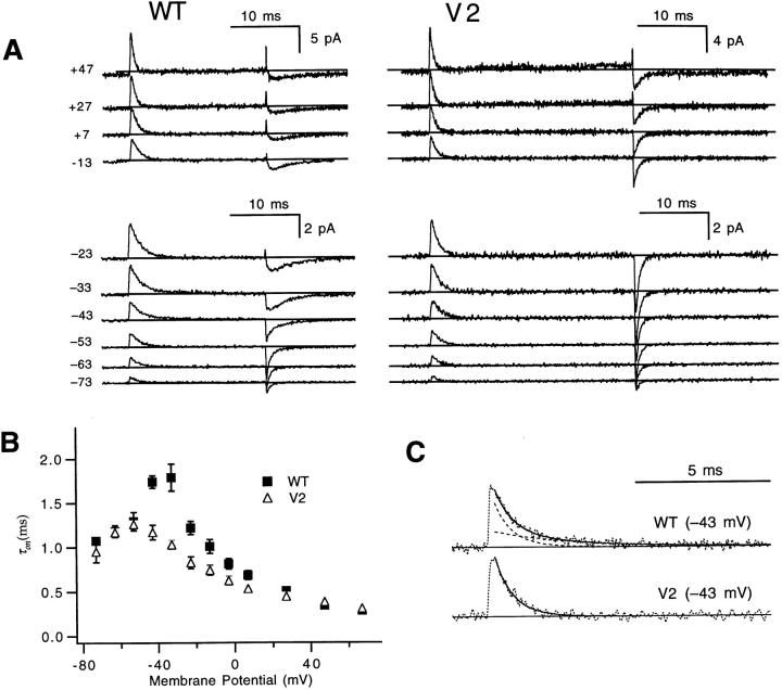 Figure 3. V2's effects on gating currents. (A) WT (left) and V2's (right) gating currents induced by voltage steps from −93 mV to test voltages between −73 and +47 mV. WT and V2 have roughly similar on current time courses at most voltages, but V2 displays markedly faster off current kinetics after the larger depolarizations. The upward deflections at the end of the test pulses at depolarized voltages reflect a leak subtraction artifact arising from charge movement that occurs during the −133- to −153-mV voltage pulse used to calculate the leak and capacitive currents (Stühmer et al., 1991). Patches w212 and v219. (B) The time constant τon fitted to the decay of WT and V2's on gating currents have similar values at most voltages, but are nearly two times faster at some intermediate voltages near −40 mV. Each value reflects three to seven experiments, except WT's value at +67 mV (n = 1). (C) V2's faster decaying on gating current at −43 mV in A reflects the absence of a slow component that is present in WT's currents, associated with WT's channel opening. WT's trace (top) has been fitted to a sum of two exponentials with time constants equal to 1.2 and 4.8 ms (dashed curves). The bottom trace shows that a scaled version of the fast component (τ = 1.2 ms) accounts for V2's current very well. Horizontal lines reflect the estimated baseline of the current, taken from the mean current during the last 2 ms of the test pulse.