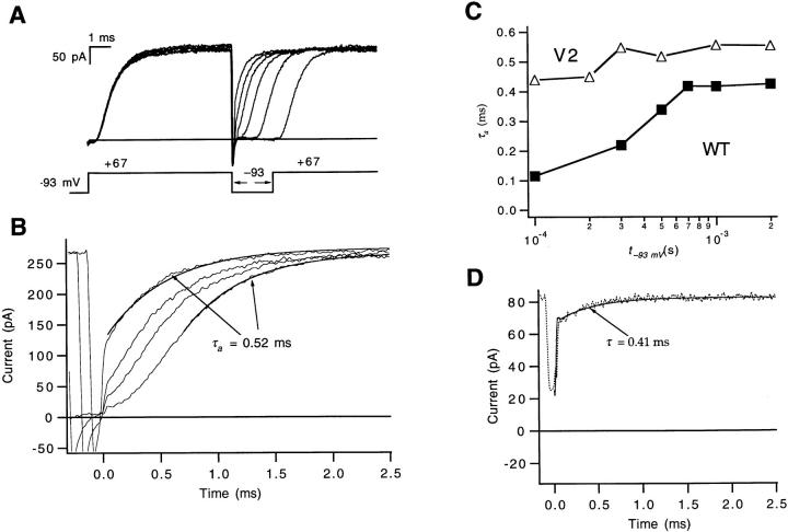 Figure 5. Failure to estimate αN from V2's reactivation time courses. (A) V2's ionic currents elicited by a triple-pulse stimulus, using a pair of depolarizations to +67 mV separated by a voltage step to a hyperpolarized voltage Vh = −93 mV. The displayed currents correspond to hyperpolarizations of different durations th between 100 and 2,000 μs. Tail currents during the second pulse were inward since the pipette solution contained 5.4 mM K+ replacing an equivalent amount of the N-methyl- d-glucamine+ (NMDG+). Data were filtered at 12 kHz. Patch v165. (B) No fast-reactivating component is evident in the same traces that have been expanded and time shifted to align the start of the test pulses. Only traces corresponding to th = 100, 200, 300, and 500 μs are shown. The current for th = 500 μs has been fitted to a single exponential (with τa = 0.52 ms), and the current for th = 100 μs is shown to be reasonably described by an exponential with the same time constant. (C) The negligible effect of prepulses of different th on V2's reactivation time course compares with the strong dependence for WT, reflected in the nearly fourfold decrease in the derived τa values for shorter th. Patches w448 and v165. (D) V2's reactivation time course at +67 mV in a different patch (v162) for Vh = −13 mV and th = 100 μs. To demonstrate that we have not missed a fast reactivating component that may have been obscured in the instantaneous current change, the reactivation time course has been fitted to Eq. 7 from Schoppa and Sigworth (1998a), which explicitly takes into account the delays in the recording system. It was assumed that the change in current due to gating is described by a function x(t) with a time constant (τ = 0.41 ms) that matches the τa value derived from V2's ionic current at +67 mV, measured in the absence of any conditioning pulses. The amplitude (−15 pA) was taken from the amount of decay of V2's tail current in the same patch at 100 μs. Data were filtered at 12 kHz.