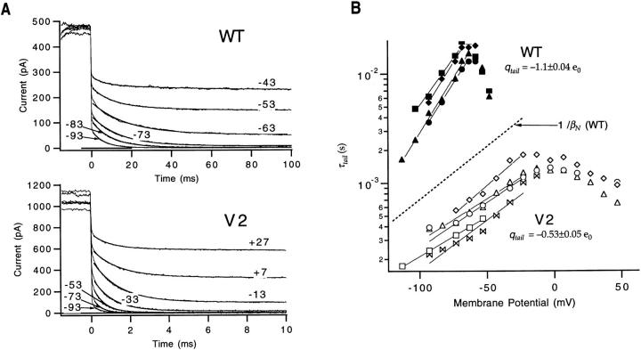 Figure 6. Estimate of βN. (A) Across a range of test voltages, WT's tail currents decay much more rapidly than V2's (taking into account the different time scales). The tail currents were measured after prepulses to +7 and +67 mV, respectively, for WT and V2; they were outward since measurements were made with 0 mM pipette K+. Estimates of the tail current decay time constant τtail were obtained by fitting the deactivation phase of the tail current to a single exponential. (B) The τtail values obtained from four WT (closed symbols) and five V2 (open symbols) patches were fitted to an exponential function of voltage yielding estimates of τtail(0) and qtail. Fits were made only to the τtail values at voltages at which the time constant values become faster with increasingly negative voltages (V ≤ −63 mV for WT and V ≤ −23 mV for V2). For most of the patches, currents were measured in 0 mM pipette K+, but for one patch each for WT and V2, currents were measured with 14 mM pipette K+ (▴ and □, respectively). For comparison, the value of 1/βN derived for WT in Schoppa and Sigworth (1998a) is plotted as a straight dashed line, indicating that V2's tail current decay has a similar voltage sensitivity as the channel closing rate.
