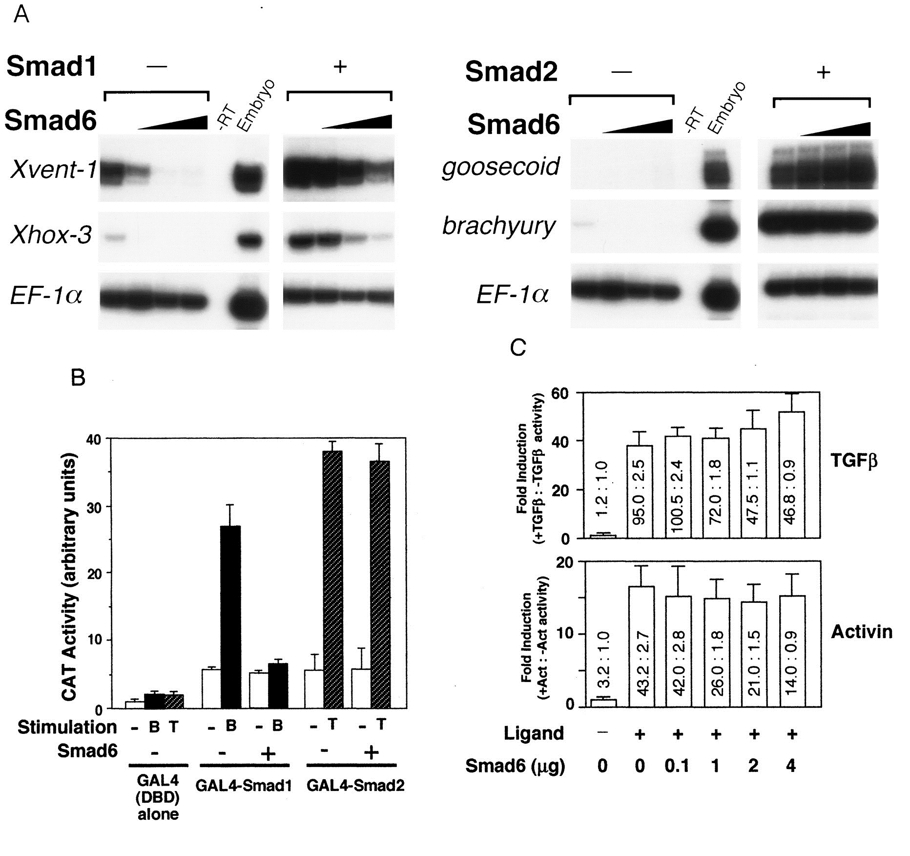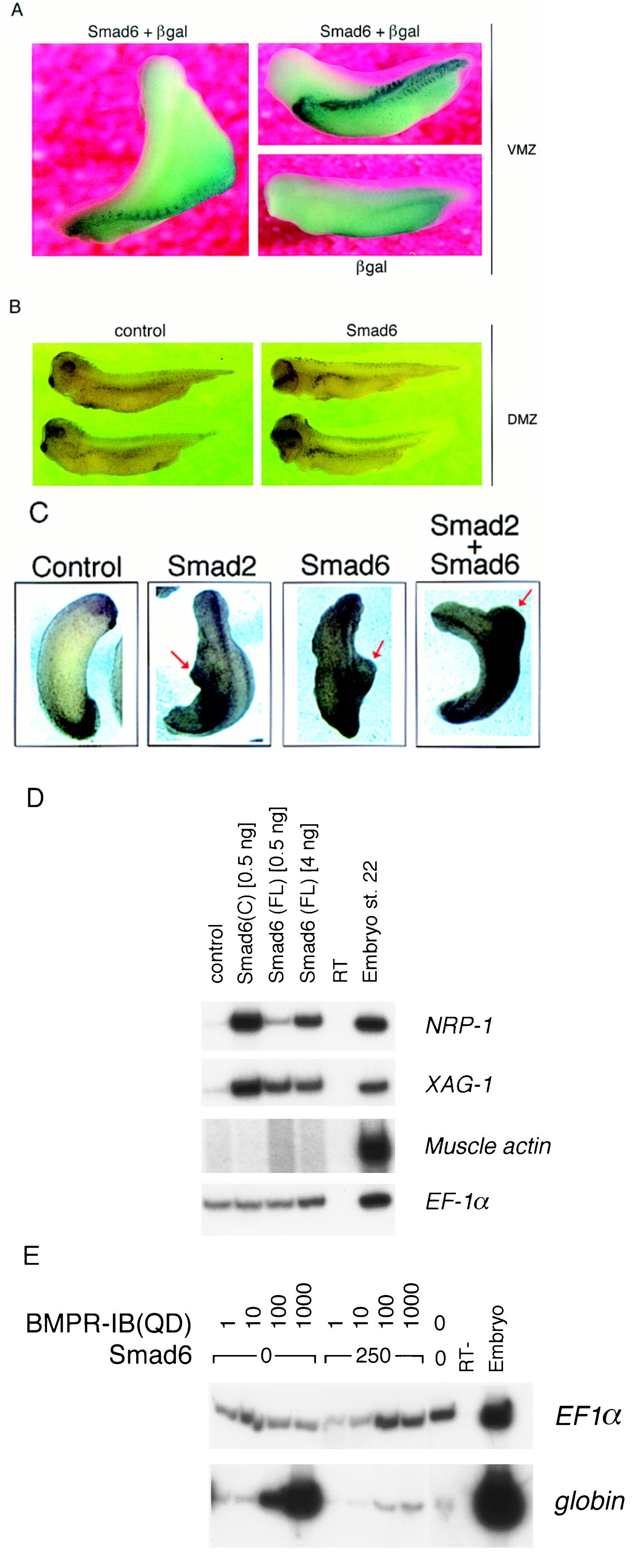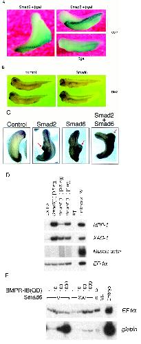 Genes referenced: acta4 actc1 actl6a ag1 bmp2 bmpr2 cat.2 gad1.2 gsc lgals4.2 ncoa3 nrp1 rpl17 smad1 smad10 smad2 smad4 smad6 smad6.2 smad7 tbx2 tbxt ventx1.2