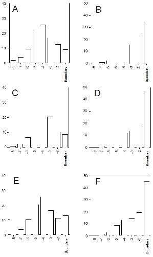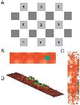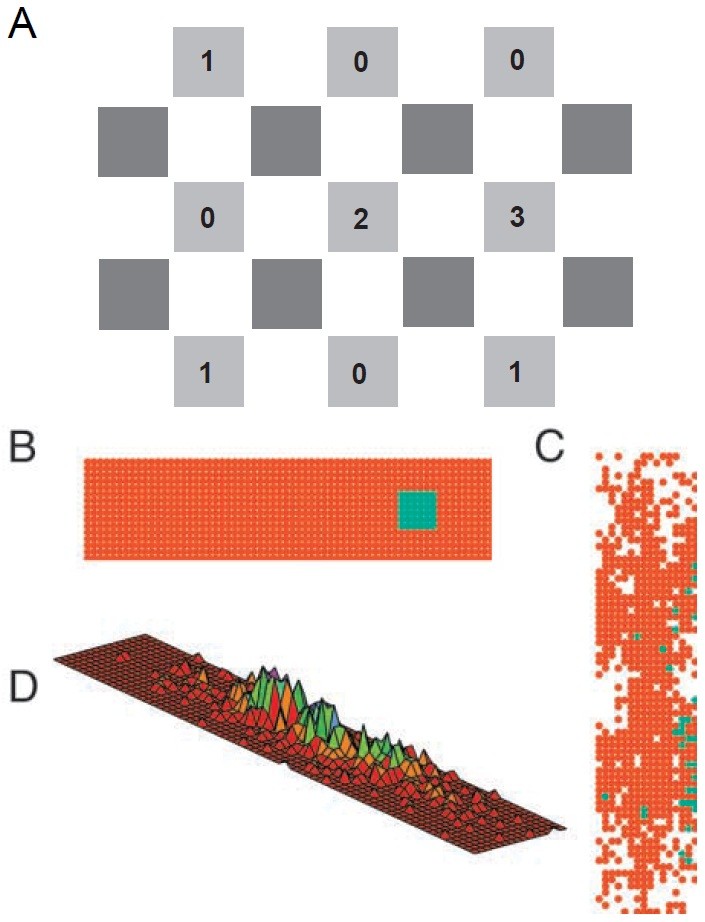 of the starting array. (B,D,F) Distribution of a patch of cells placed