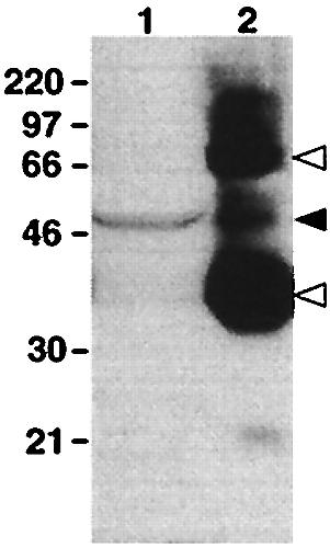 Figure 1 Western blot of protein extracts from dermal melanophores and whole eye probed with an antiserum raised against bovine rhodopsin. Indicated molecular masses are in kDa. Lanes: 1, total protein from cultured melanophores; 2, 1% of total protein from a whole early postmetamorphic adult eye. A 50-kDa immunoreactive band is present in both lanes (solid arrowhead). The 35- and 70-kDa bands in lane 2 are monomeric and dimeric rhodopsin, respectively (open arrowheads).