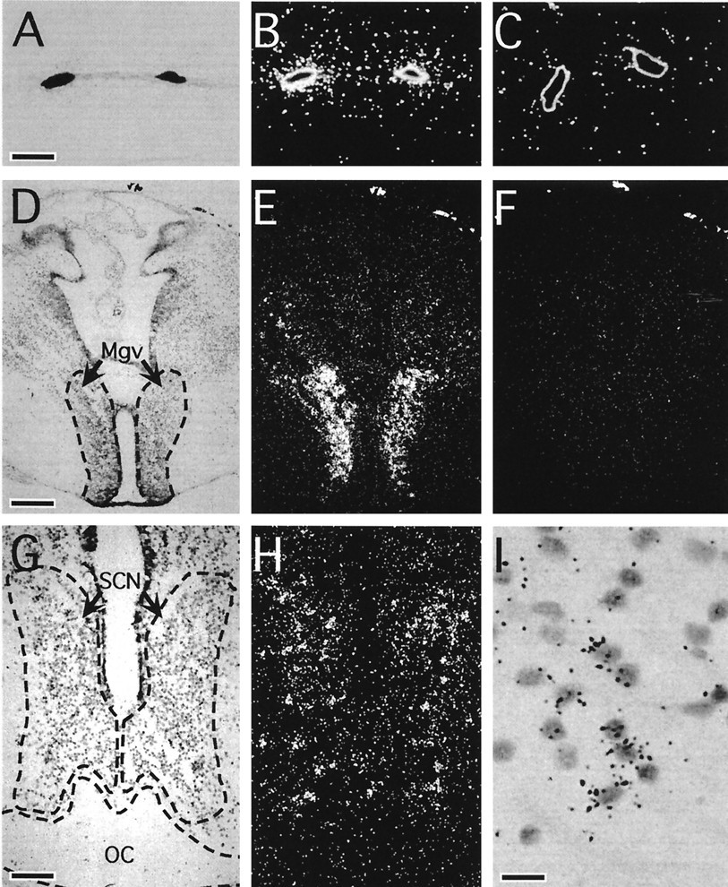 Figure 4 Bright-field and dark-field photomicrographs of melanopsin transcript distribution within extraocular structures. Melanopsin message was localized to tadpole (stages 56 and 57) dermal melanophores (A and B), the ventral aspect of the magnocellular preoptic nucleus (Mgv) (D and E), and the SCN (G and H) of the tadpolebrain (stages 56 and 57). Cell-specific antisense hybridization was restricted to a subset of SCN cells (I). In contrast, incubation with the sense control probe yielded no hybridization above background (C and F). (Corresponding bright-field views are not shown.) OC, optic chiasm. [Bars = 20 μm (A), 150 μm (D), 75 μm (G), and 15 μm (I).]