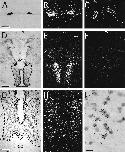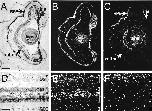 Figure 5 Bright-field and dark-field photomicrographs of melanopsin transcript distribution within ocular structures. In sections of tadpole (stages 56 and 57) (A and B) and adult (D and E) eye, melanopsin transcripts were identified in retinal cells within the outer lamina of the inner nuclear layer (INL) (A, B, D, and E). In contrast, incubation of adjacent sections with the sense RNA probe (C and F) resulted in no labeling above background. (Corresponding bright-field views are not shown.) Intense cell-specific hybridization was also observed in the iris and less intensely within the RPE. GC, ganglion cell layer; ONL, outer nuclear layer; OS, photoreceptor outer segments. [Bars = 150 μm (A) and 35 μm (D).]