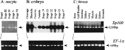 Fig. 4. Distribution of Xp100 transcripts in Xenopus development. Total RNA extracted from staged oocytes (A), staged embryos (B) or adult tissues (C) was converted to cDNA followed by PCR amplification using appropriate sets of primers as described in Section 2(top and bottom panels) Arrows indicate amplified fragments of Xp100 (top) or EF-1α (bottom). The Xp100 fragment derived from cDNA of staged embryos (B, top) was detected by Southern blotting followed by hybridization, since several additional bands were co-amplified.