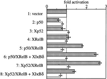 Fig. 3. Transcriptional activity of Xp52. Either [κB]6TK-CAT (hatched columns) or [κBM]6TK-CAT (open columns) was transfected with the indicated combinations of the expression vectors. CAT activity was measured as described in Section 2. CAT activity with the control vector was set to 1. Values correspond to means±SEMs of at least three independent experiments.