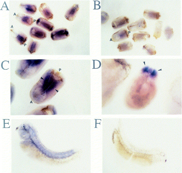 Fig. 5. Localization of Xp100 transcripts in Xenopus laevis development analyzed by whole mount in situ hybridization. Embryos in the late neurula stage (A, B, C, D) or tailbud stage (E, F) were analyzed by whole mount in situ hybridization with either anti-sense probe (A, C, D, E) or sense probe (B, F). In (A), (B) and (C), `A' and `P' indicate anterior and posterior, respectively. Arrowheads in C and D indicate the region of somitogenic mesoderm. Embryos were observed from either dorsal side (A, B and C) or posterior side (D). (C) and (D) are magnified photos of the embryo prepared as in (A).