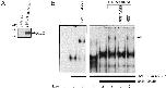 Fig. 2. DNA binding activity of Xp52. (A) Expression of the Xp52 protein in COS cells. Cell lysate was prepared from COS cells transfected with either a control vector (pME18S) or the Xp52 expression vector (pME-FLAG-Xp52) and Western blotting was performed using anti p52 antibody as described in Section 2. (B) XRelB/Xp52 heterodimer binds to κB sites. Nuclear extracts were prepared from the COS cells transfected with a control expression vector, pME18S (lane 1), the pME-FLAG-Xp52 alone (lanes 2â4) or in combination with pME-XRelB (lanes 5â8). EMSA was performed as described in Section 2. Binding reaction included anti-FLAG antibody (lanes 3) or anti-XRelB antibody (lanes 6â8) together with either GSTXRelB protein (lane 7) or GST protein (lane 8). An arrow indicates XRelB/Xp52 heterodimer supershifted by anti-XRelB antibody. Only a portion of the gel, which contains specific proteinâDNA complexes, is shown.