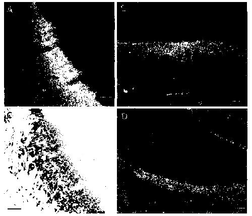 b,d: Darkfield photomicrographs of trkB hybridization in the (b) ampullary cristae and (d) amphibian papilla. Scale bar= 17 btm.