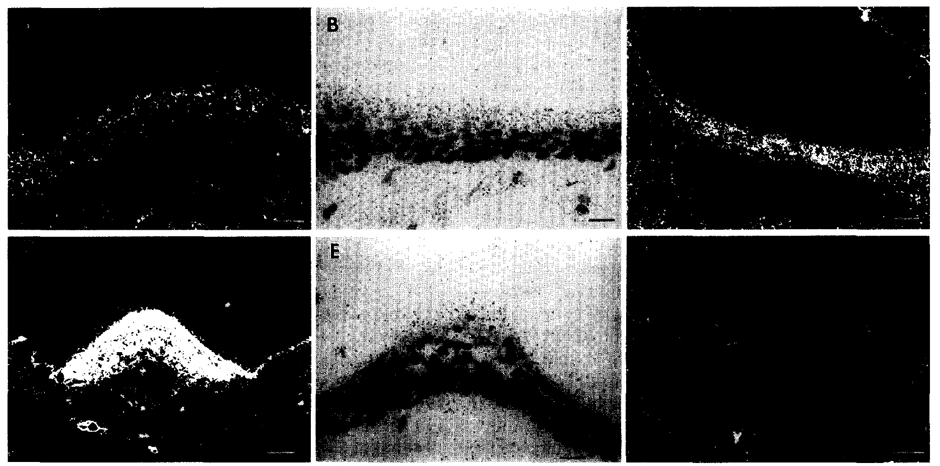 of BDNF transcripts in the (b) macular sacculi and (e) ampullary cristae. Scale bar = 17 ~tm. f: Darkfield photomicrograph demonstrates sense