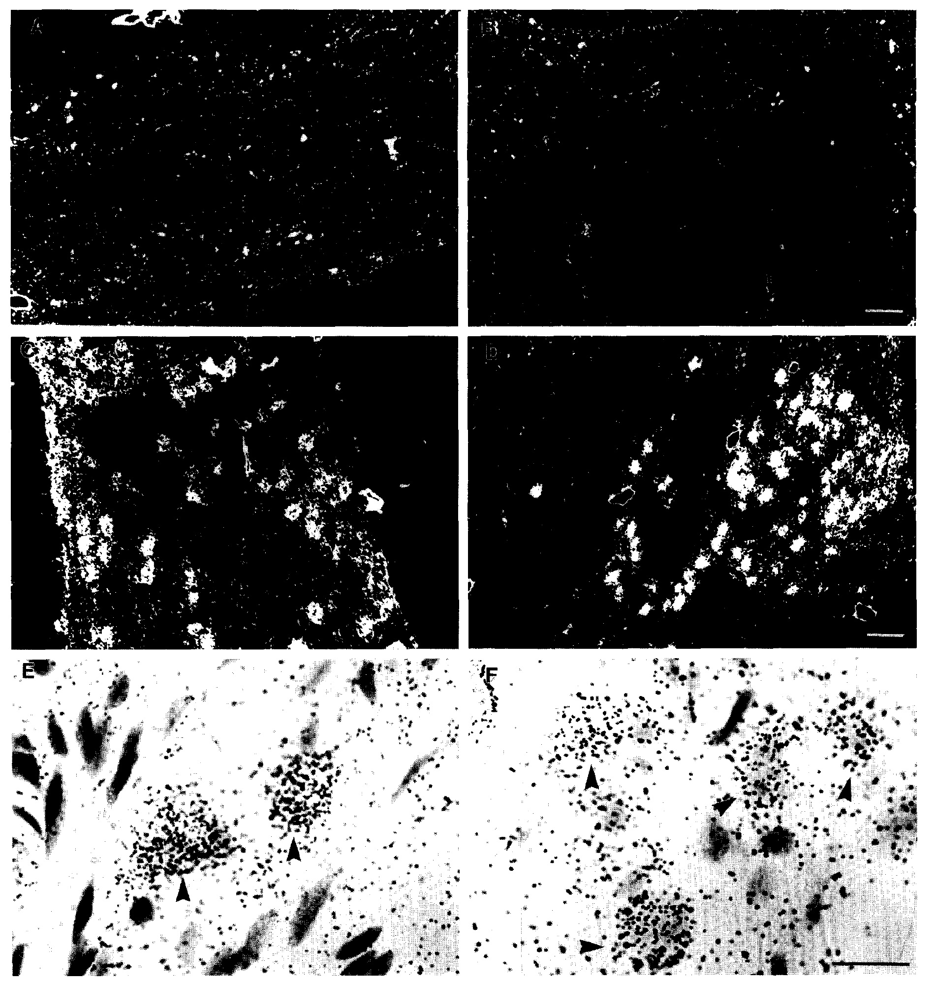 bar = 140 lam. b: Darkfield photomicrograph of the brainstem at the level of the eighth nerve root displays trkB hybridization in cells (arrows)