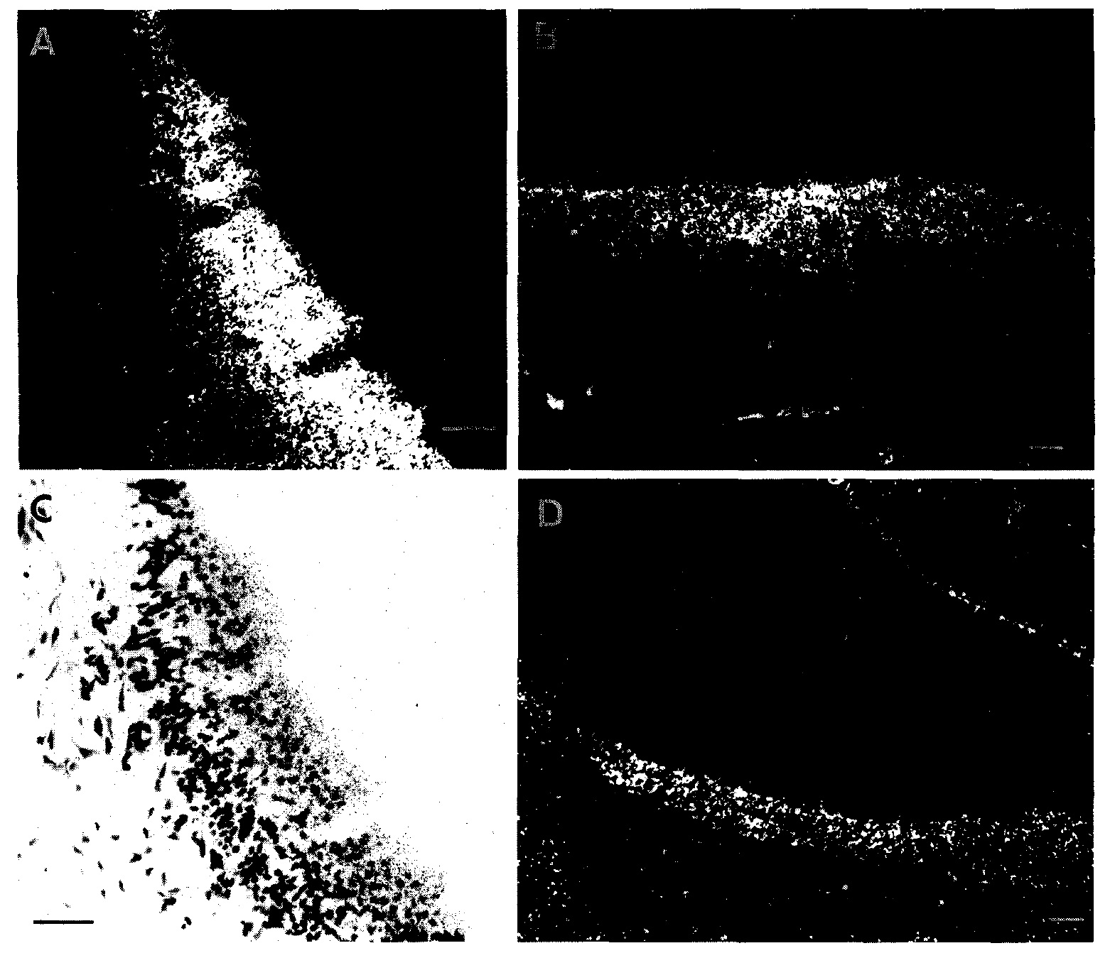 controls for (a) BDNF and (b) trkB. Note the lack of specific hybridization. Scale bar= 50 ~m. c: Darkfield photomicrograph displays