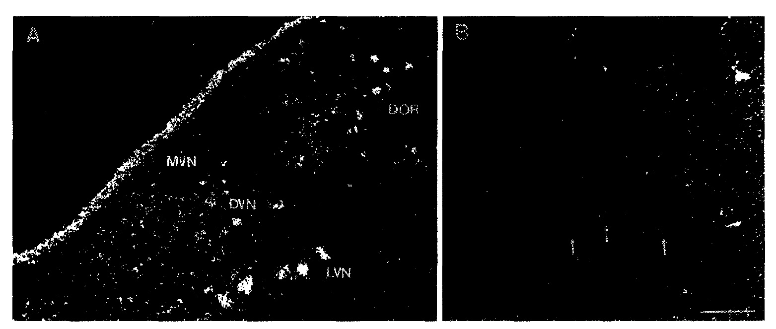 photomicrograph of the brainstem demonstrates BDNF mRNA in the vestibuloauditory nuclei at the level of entry of the eighth nerve⢠DO,
