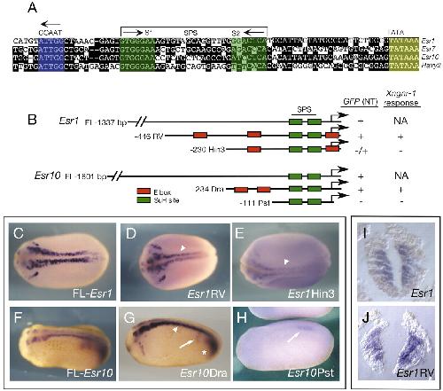 Fig. 3. Compact elements drive neural Esr gene expression.(A) Promoters of Esr1, Esr7, Esr10 and Hairy2 (Davis et al., 2001) show high and moderate homology of S1 and S2, respectively, in the SPS (green). All exhibit a conserved CCAAT motif (blue). GFP expressed by deletion mutants of Esr1 (B,C-E) and Esr10 (B,F-H) in transgenic frogs, followed by whole-mount in situ hybridization, indicates that short elements drive Esr gene expression in the neural tube (D,G, arrowheads). Esr10/Dra also drives somitomeric (G, arrow) and tailbud (G, asterisk) GFP expression. Deletion to a Hin3 (E) site attenuates Esr1 GFP, although expression remains restricted to neural tissue (E, arrowhead). Deletion to a Pst site (H) abrogates Esr10 neural expression, although diffuse somitomeric expression (H, arrow) remains. Activities using the neural tube (NT) as a reference are summarized in (B, right; see Table 1 for details). Sections through the neural tube of stage 20 Esr1/RV transgenic embryos (J) show GFP-positive cells in the ventricular zone in a pattern similar to the endogenous gene (I). Also summarized (B, right) are data reported in Figs 4, 6 and 8 and Table 2 that are relevant to responses to ectopic Xngnr1 (NA; not assayed).