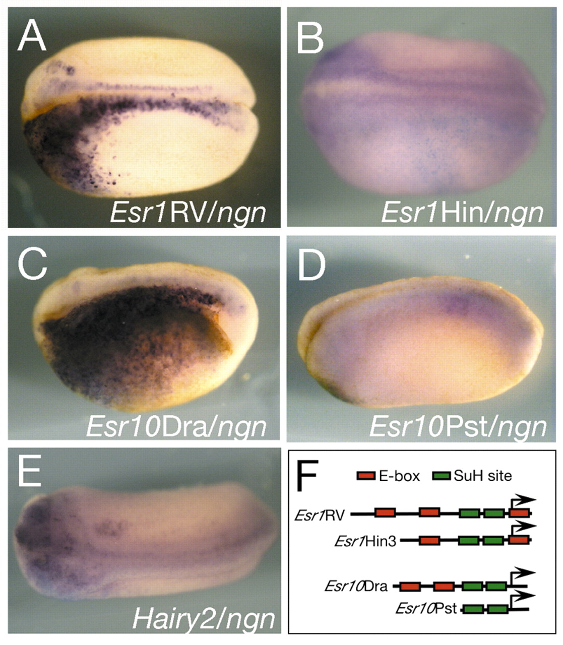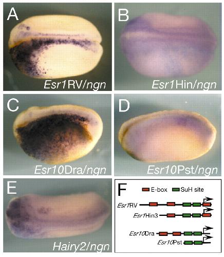 Fig. 4. Proximal elements constitute Esr1 and Esr10 proneural enhancers. Sequences driving neural GFP expression of Esr1 and Esr10 constructs are shown schematically in F. (A-E) Xngnr1 mRNA (ngn) with a lacZ tracer mRNA was injected into embryos made transgenic with sequences flanking Esr1, Esr10 and Hairy2. Embryos were stained for GFP by in situ hybridization. GFP expression driven by Esr1/RV (A) and Esr10/Dra (C) is induced by Xngnr1. Esr1/Hin3 (B), Esr10/Pst (D) and the 500 bp H2 flanking sequence (E) are not, indicating that they lack elements responsive to proneural input.