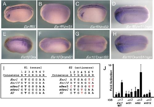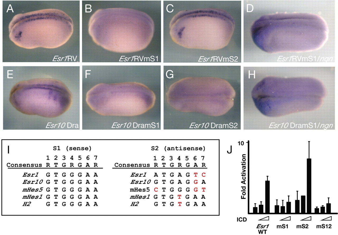 Fig. 5. An intact SPS is required for Esr1 and Esr10 expression. S1 (I, left) is highly conserved in Esr1, Esr10 and homologous genes, and matches the optimal RTGRGAR consensus determined by Tun et al. (Tun et al., 1994). S2 of Esr1, Esr10 and several E(spl) homologs is less conserved (mismatches in red). S2 is reported as the bottom strand. Su(H) sites within the SPS of Esr1 (B,C) and Esr10 (F,G) were mutated individually (mS1 or mS2) by changing G5 to a C, and GFP expression in transgenics was monitored by in situ hybridization and compared with wild-type controls (A,E). Neural and somitomeric Esr10 expression required two intact Su(H) sites (F,G), while neural Esr1 expression required only S1 (B,C). Injection of Xngnr1 (ngn; injected side down) mRNA could not rescue GFP expression in embryos carrying S1 mutations of Esr1 (Esr1/RvmS1) (D) or Esr10 (Esr10/DramS1) (H). (J) Luciferase activity of HeLa cells transfected with Esr1/RV SPS mutants showed that whereas mS1 abrogated transcription, mS2 had no effect.
