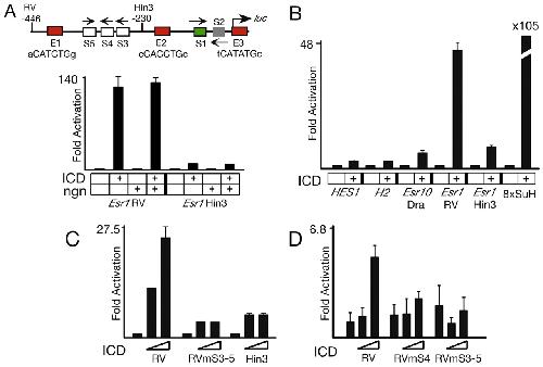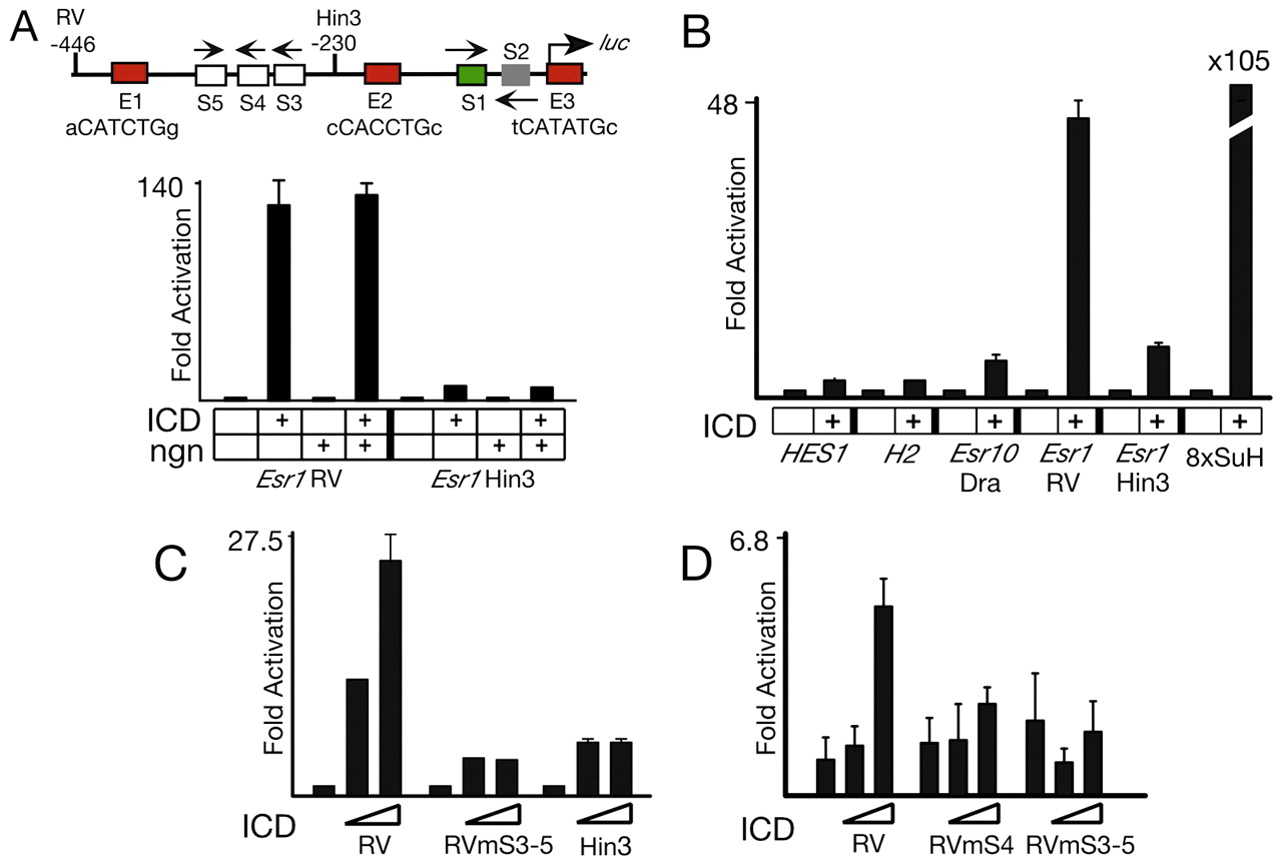 Fig. 7. The Esr1 enhancer does not require E-boxes and responds to Notch through two loci. (A) Luciferase activity of Esr1/RV and Hin3 fragments co-transfected with activated Notch (ICD) plus or minus Xngnr1 (ngn). (B) Luciferase activity of Esr1/RV and Esr1/Hin3 vectors co-transfected with ICD compared with proximal elements from mouse Hes1 (Jarriault et al., 1995) and Xenopus Hairy2 (Davis et al., 2001), Esr10/Dra and a vector containing eight multimerized Su(H) sites (Ling et al., 1994). Cells were transfected simultaneously with equal levels of ICD (100 ng/well) relative to the reporter (100 ng/well). (C) Luciferase activity of Esr1/RV co-transfected with increasing (25 ng/well and 100 ng/well) levels of ICD compared with a construct in which all upstream Su(H) sites are mutant (Esr1/RVmS3-5) or the Esr1/Hin3 deletion mutant. Unlike the wild-type reporter, luciferase activity of the Su(H) and Hin3 mutant constructs saturates at low (25 ng) ICD levels. (D) An S4 mutation results in loss of transcription similar to Esr1/RVmS-35.