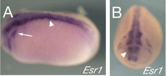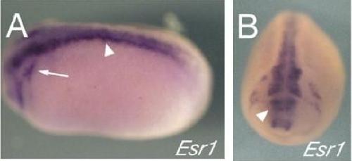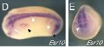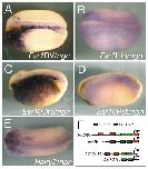 esr10 (enhancer of split related 10) gene expression in Xenopus laevis embryo, assayed via in situ hybridization, NF stage 19-21, lateral view, anterior left, dorsal up (D) and anterior view (E).