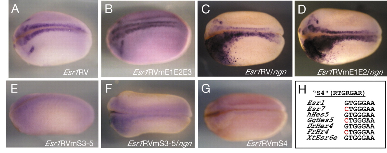 Fig. 8. Esr1 enhancer activity requires upstream Su(H) sites in vivo. (A,B) GFP expression in frogs transgenic with enhancer elements containing mutant E-boxes (Esr1/RVmE1E2E3) versus wild-type controls. Wild-type (C) and E1E2 mutant (D) embryos were injected with mRNA encoding Xngnr1 (ngn) and stained for GFP. GFP expression in frogs with mutant enhancers is unchanged relative to controls. (E,F) Transgenic frogs bearing Esr1 enhancer elements mutant in upstream Su(H) sites (Esr1/RVmS3-5) show greatly attenuated GFP activity (E) relative to controls (A), and activity is not inducible following Xngnr1 injection (F). (G) Within the S3-5 cluster, mutations within S4 (H), which is conserved in sequence and position in numerous Esr1 homologs, greatly attenuate enhancer activity.