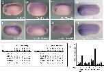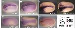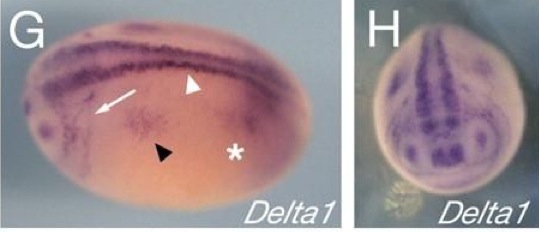 dll1 (delta-like 1) gene expression in Xenopus laevis embryo, assayed via in situ hybridization, NF stage 19-21, lateral view, anterior left, dorsal up (G) and anterior view (H).