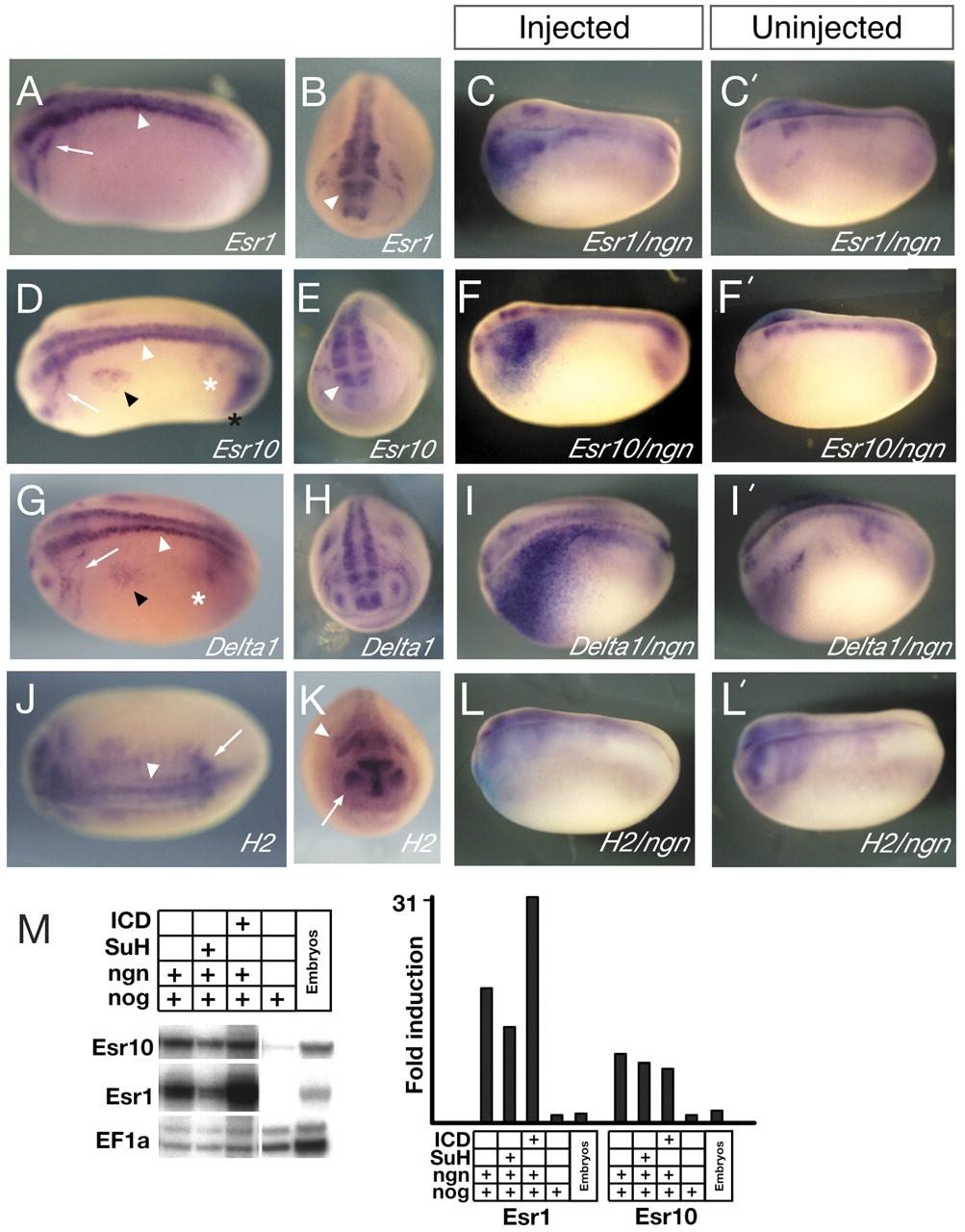 Fig. 2. Esr1 and Esr10 are expressed in proneural domains. Esr1, Esr10 and Delta are expressed in the neural tube (A,D,G, white arrowhead), cranial ganglia (A,D,G, arrow) and anterior neural tube (B,E, arrowhead). Esr10 is also expressed in the tailbud (D, black asterisk) and somitomeres (D, white asterisk). Delta1 is also seen in somitomeres (G, white asterisk), although the Notch ligand predominantly expressed in the tailbud is Delta2 (Jen et al., 1997). At neurula stages, Hairy2 is barely detectable in the neural tube (J) but expressed in presumptive neural crest (K, arrowhead). Hairy2 expression in the eye (K, arrow) precedes that of Esr1 and Esr10. Misexpression of mRNA encoding Xngnr1 induces Esr1 (C), Esr10 (F) and Delta1 (I); Câ², Fâ² and Iâ² show uninjected sides. Hairy2 is not upregulated by misexpressed Xngnr1 (L; Lâ², uninjected side). Turquoise stain in C,F,I,L reflects activity of the lacZ tracer gene. (M, left) RNase protection assay showing that expression of Xngnr1 in neuralized animal caps analyzed at stage 12 induces Esr1 and Esr10 that can be inhibited by expression of SuH, and in the case of Esr1, further increased by co-injection of ICD. EF1a expression serves as a loading control; `Embryos' indicates staged-matched controls. Quantification (right) shows fold increases in Esr1 and Esr10 relative to their respective `noggin only' control, which is set arbitrarily to 1.
