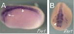 hes5.1 (hes family bHLH transcription factor 5) gene expression in Xenopus laevis embryo, assayed via in situ hybridization, NF stage 19-21, lateral view, anterior left, dorsal up (A) and anterior view (B).