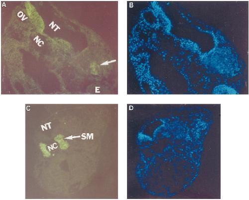 staining of the same section as in C. OV, otic vesicle; NT, neural tube; NC, notochord; SM, somites.