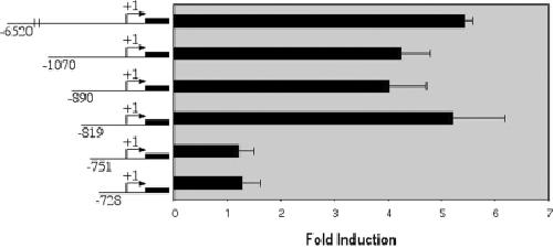 Figure 3. Deletion analysis maps a BRE to a 68 bp region upstream of the gata2 promoter. A progressive series of 5′ deletions was used to measure the relative activity of the promoter when injected with RNA encoding BMP4, compared to the same reporter when injected with non-coding control RNA, as described in Materials and Methods. For each construct, the site of truncation is indicated, the +1 indicates the transcriptional start site, and the box represents the firefly luciferase reporter. The fold difference (induced/uninduced) is plotted and shows a significant drop when sequences are deleted between −819 and −751. This 68 bp sequence is designated BRE1.