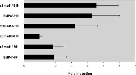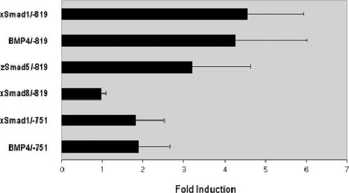 Figure 4. BRE1 mediates activation by BMP4 or Smads. The inducible reporter (−819) or the reporter lacking BRE1 (−751), as diagrammed in Figure 3, was co-injected into Xenopus embryos with RNA encoding Smad1, BMP4, Smad5 or Smad8, as indicated. Smad1 activates the reporter equivalent to BMP4, and in both cases this is dependent on the presence of the BRE1 sequences. Smad5 is only slightly less active, while Smad8 fails to induce reporter activity.