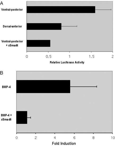Figure 2. The gata2 promoter directs reporter gene activity that is induced by BMP4 and dependent on Smad signaling. (A) The luciferase reporter was injected at the four-cell stage into blastomeres that contribute preferentially to ventral or dorsal regions of the embryo, as indicated. The reporter is more active in the ventral-posterior derivatives, but this is abrogated by co-injection of RNA encoding the inhibitory Smad6 (the error bar for this sample is present, but it is so small that it is not evident). The results indicate that the reporter responds as predicted to the endogenous Smad-dependent BMP signaling pathway. (B) The gata2 promoter is induced ∼5-fold by co-injection of RNA encoding BMP4. This activation is also blocked by co-expression of Smad6.