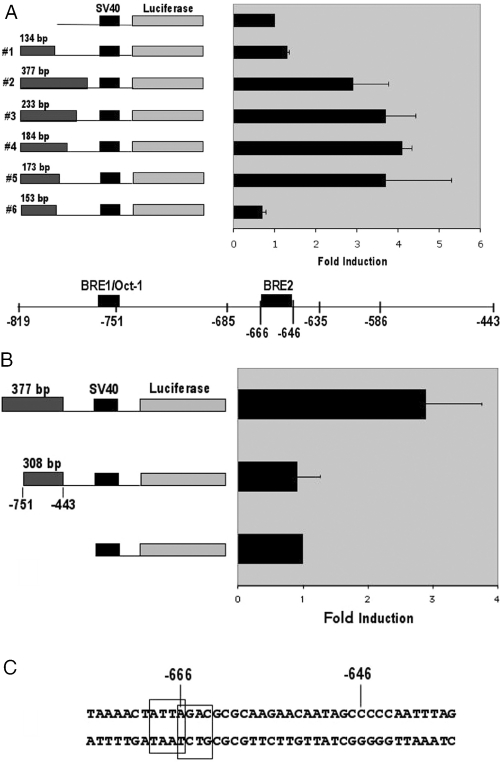 Figure 5. Mutation of an octamer element located at the 3′ end of the BRE1 is sufficient to block BMP-induced activation of the promoter. (A) A series of specific mutations were introduced into the BRE1 by site-directed mutagenesis for potential Smad-binding sites (mutations #1–5) or for an A/T-rich sequence (mutation #6), or a putative octamer binding site (mutation #7). (B) When compared to the BMP-inducible reporter containing the intact BRE1 (−819), none of the first six mutations had a significant effect on induction. In contrast, mutation of the putative octamer binding site (mutation #7) blocked BMP-mediated induction, similar to deletion of the BRE1 (−751).