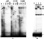 Figure 6. The octamer site of BRE1 binds Oct-1 in Xenopus nuclear lysates. (A) Gel mobility shift assays were performed using a labeled probe containing the BRE1 sequences including the putative octamer binding site. Lane 0 represents probe alone and the position of the free probe is indicated (P). In lanes marked with a ‘+’, a specific complex forms using nuclear extracts derived from stage 13 embryos, as indicated by the arrow in the second lane. The complex is competed specifically by the addition in the reaction of excess (10×, 25× or 100×) unlabeled probe DNA (self) or DNA containing the octamer consensus (octamer), but not by DNA containing the same mutation of the octamer that blocks the induction by BMP4 (mutant). (B) Similar gel mobility-shift assays were performed. In this case, the lanes include probe alone (0), nuclear extract (1), nuclear extract and antibody to Xenopus Oct-1 (2) or a control isotype-matched antibody (3). The free probe is indicated (P) as are the positions of a non-specific complex (NS), the specific complex (SP) and the complex that is super-shifted by addition of the Oct-1 antibody (SS).