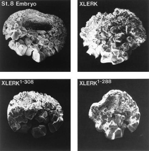 Scanning electron microscopy of XLerk-expressing embryos during the early blastula stage of development. 2-Cell stage embryos were injected with 2.5 ng of capped XLerk, XLerk1–308, or XLerk1–288 mRNA in each blastomere. Embryos were then fixed at stage 8 in 4% formaldehyde/1.25% glutaraldehyde and prepared for SEM.