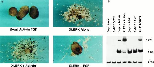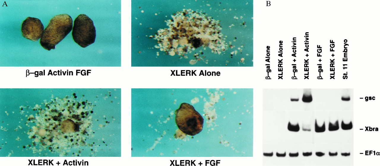 (A) Morphological analysis of animal caps demonstrating the rescue of XLerk-injected embryos by bFGF. Animal caps were dissected at stage 8.5 and cultured at 23°C in 67% Leibovitz’s L-15 medium, 7 mM Tris⋅HCl (pH 7.5), and 1 mg/ml gentamycin with or without 50 ng/ml Activin or 100 ng/ml bFGF. The animal caps were harvested at stage 26 as determined by uninjected embryos. These results are representative of four independent experiments. (B) Effect of XLerk on gene expression in the animal cap. Embryos were injected with either 5 ng of XLerk mRNA or β-galactosidase mRNA at the 2-cell stage. The animal caps were explanted at stage 8 and cultured in 50 ng/ml activin or 100 ng/ml bFGF until stage 11. Upon harvesting, RT-PCR analysis using primers specific for gsc, Xbra, and EF-1α was performed.