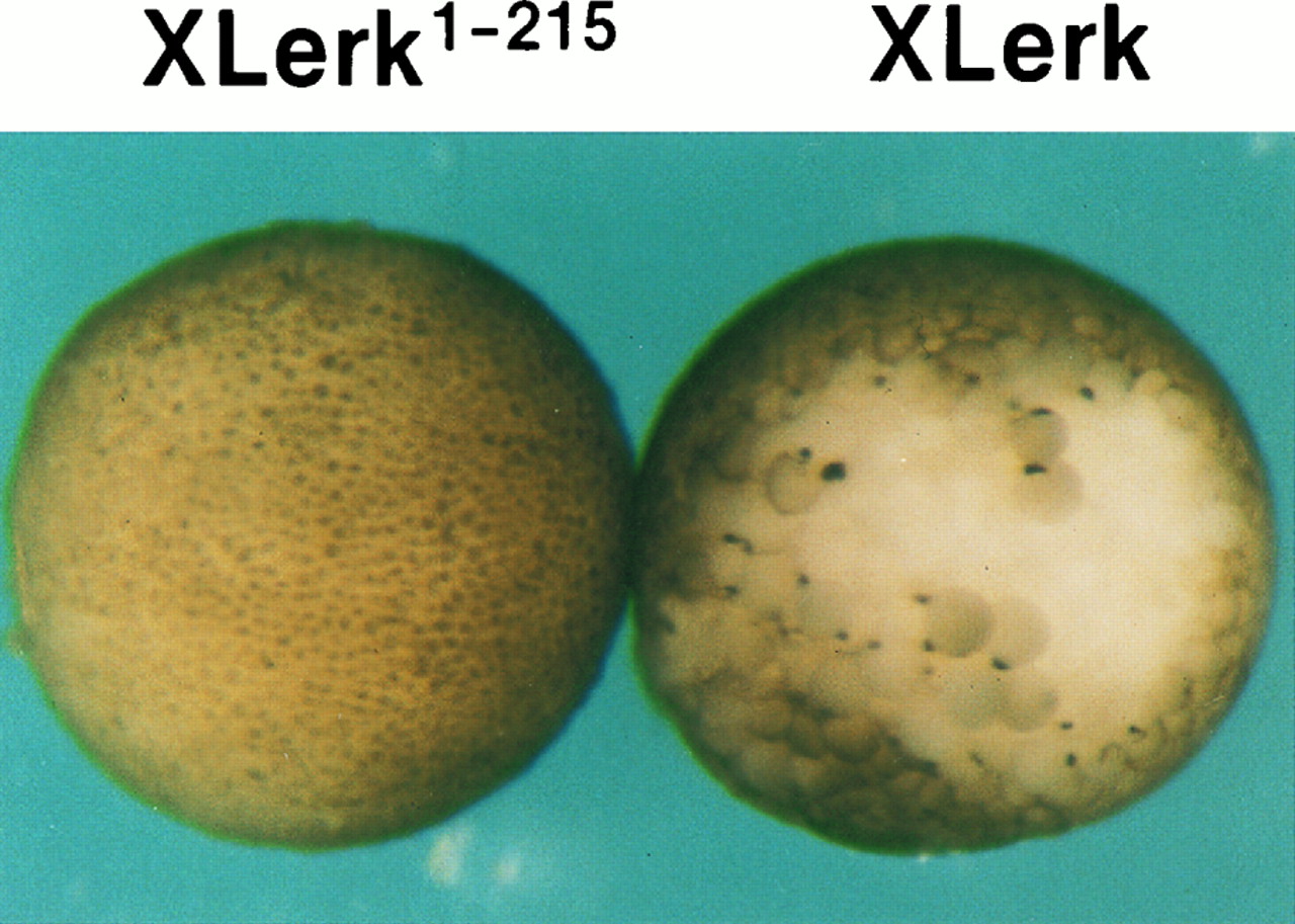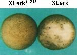 XLerk-induced blastomere dissociation in Xenopus embryos. Each blastomere of the 2-cell stage embryo was injected with 2.5 ng of either capped XLerk mRNA or XLerk1–215 mRNA, and development proceeded to the mid-blastula stage.