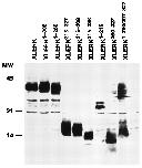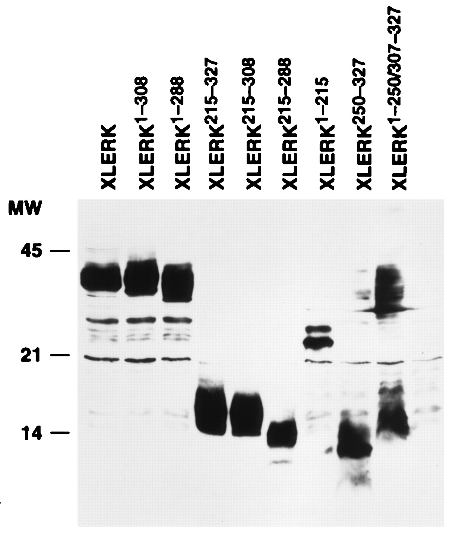 Western blot analysis of embryos injected with RNA encoding normal and mutant forms of XLerk. 2-Cell embryos were injected with 2.5 ng of RNA encoding all XLerk forms, except in the cases of XLerk215–327,215–307,215–287, where 0.5 ng of RNA were used. Extracts were prepared from stage 9 embryos, and three embryo equivalents were fractionated on 12% SDS-PAGE and then immunoblotted for the Flag epitope.