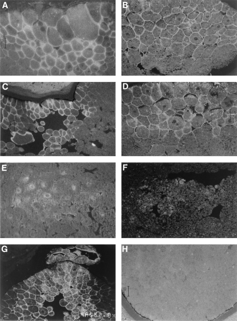 Localization of normal and mutant forms of XLerk by immunofluorescence. Embryos were injected with 2.5 ng of RNA encoding normal and mutant XLerk constructs. At stage 9, the embryos were fixed in Carnoy’s solution, embedded in parafin, and sectioned; then, immunofluorescence was performed using Flag M2 antibody and fluorescein-conjugated anti-mouse-Ig. These immunofluorescent images show that XLerk mutants retaining the transmembrane and cytoplasmic domains are localized to the membrane. (A) XLerk; (B) XLerk215–327; (C) XLerk1–308; (D) XLerk215–308. Note that an intact blastocoel is revealed in embryos expressing a C-terminal deletion of the last 19 amino acids in C. (E) Diffuse staining of XLerk250–327 that retains only the cytoplasmic domain. (F) Very low levels of diffuse staining of XLerk1–215, which just retains the ectodomain. (G) Membrane localization of XLerk1–250/307–327 and also an intact blastocoel. (H) Flag peptide competition control showing the specificity of the staining.