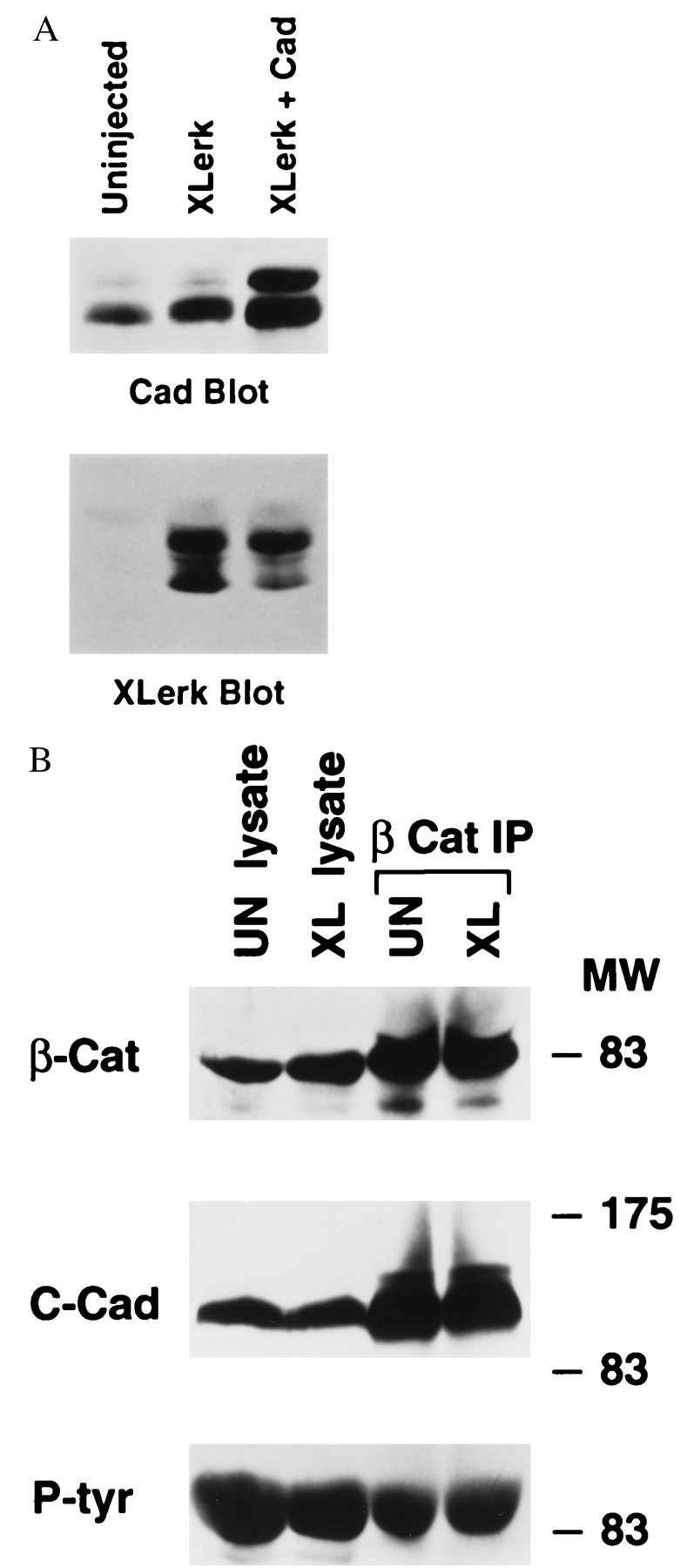 (A) Western analysis of embryos overexpressing XLerk and C-cadherin. Embryos were either left alone or injected with 4 ng of XLerk RNA, or coinjected with 1 ng of C-cadherin RNA. At stage 9, extracts were prepared, and three embryo equivalents were fractionated by SDS-PAGE. Samples were immunoblotted with C-cadherin antibodies and a C-terminal XLerk antibody (cadherin appears as a doublet, perhaps representing the precursor and product forms). (B) C-Cadherin and β-catenin expression and association in XLerk-injected embryos. Embryos were either left alone or injected with 5 ng of XLerk RNA. Stage 9 embryos were harvested, and extracts were prepared. Three embryo equivalents were fractionated by SDS PAGE, and five embryo equivalents were subjected to immunoprecipitation analysis using β-catenin antibodies (β-Cat IP) and then fractionated by SDS-PAGE. Samples were immunoblotted with antibodies to β-catenin, C-cadherin, or phosphotyrosine.