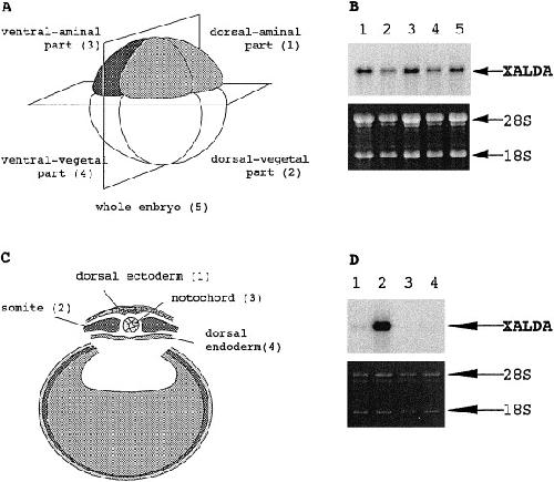 dorsalâvegetal part; 3, ventralâanimal part; and 4, ventralâvegetal part. B. Northern blot analysis of RNAs from four dissected portions