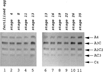 stages. Isozyme pattern was analyzed as in Fig. 10. Lane 1,