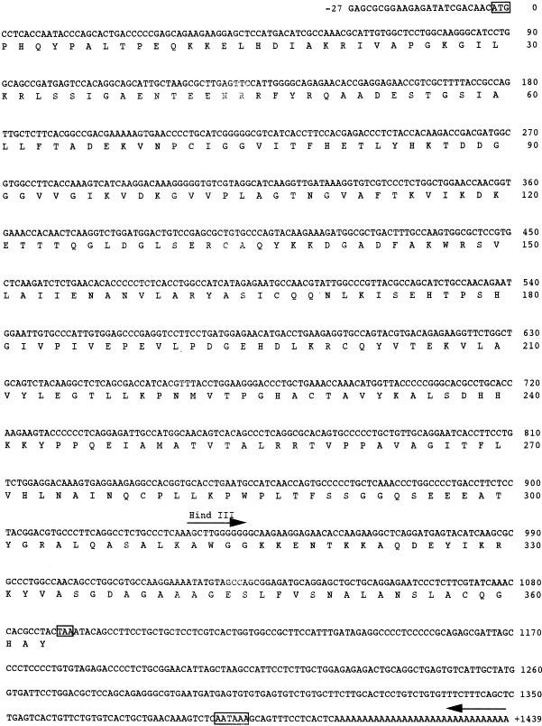 Fig. 1. The nucleotide sequence of XALDA and the deduced amino acid sequence. This clone was 1466 nucleotides long with an open